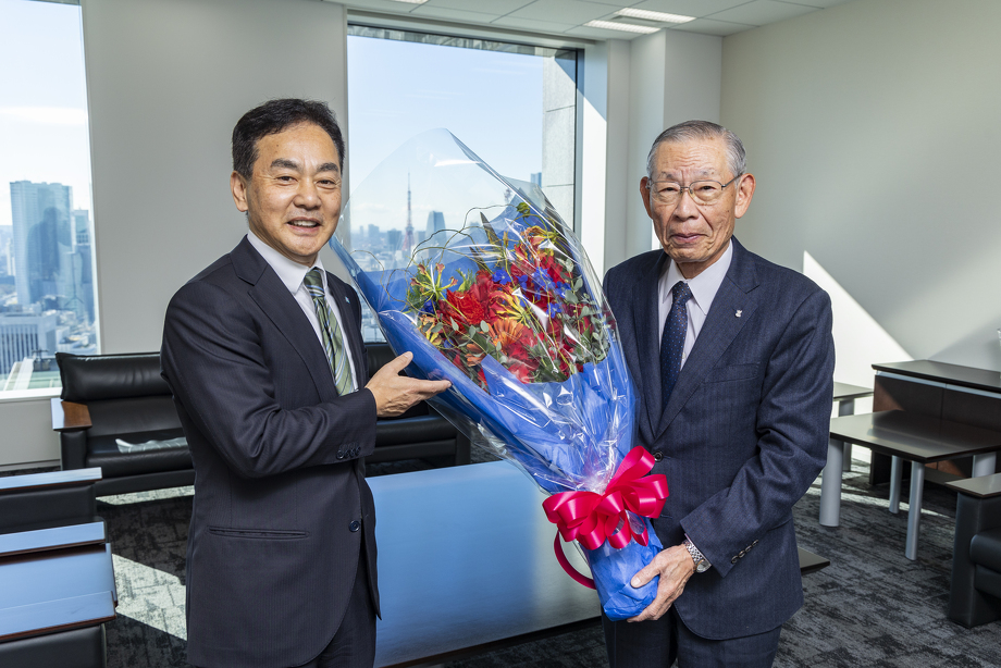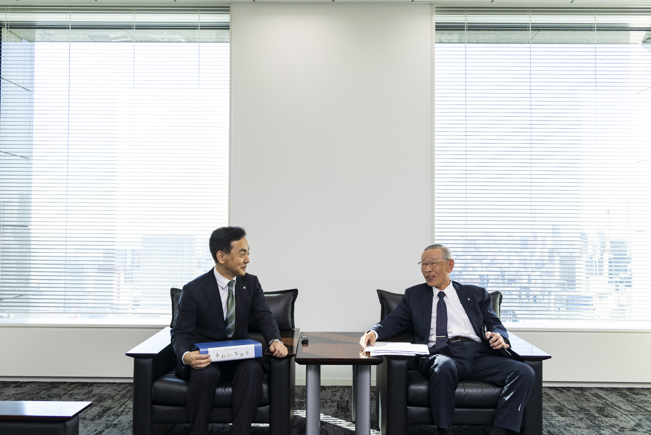 終始リラックスムードで会話が弾む佐久間前相談役と奥田代表