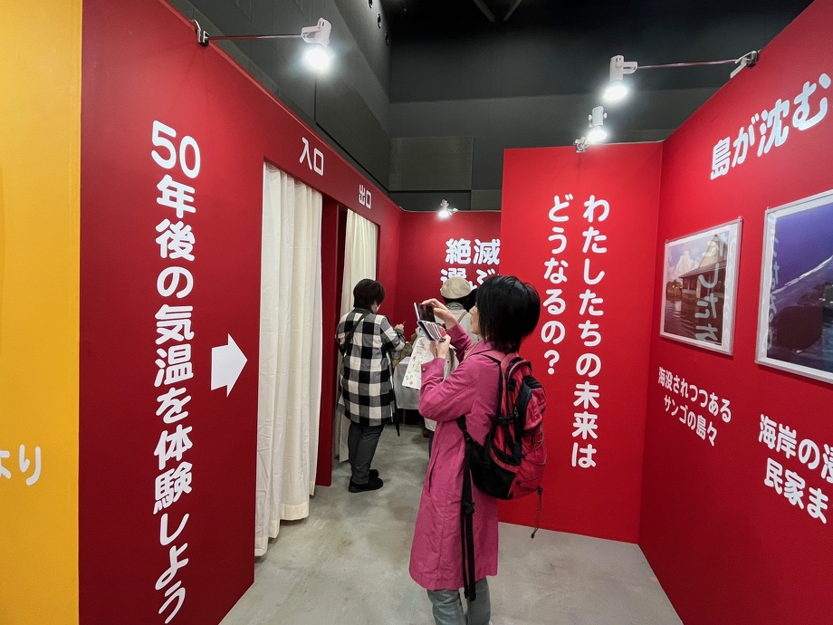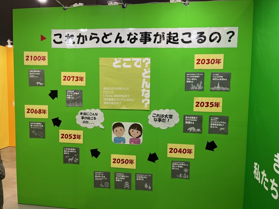 このまま温暖化が続くと地球にどのような影響があり、どのような変化があるのかを学び、最後には50年後の地球の気温が体験できるブース。50年後の地球はサウナの中で暮らしているようで人が生活できる温度ではないと感じました。こうならないためにも、私たちが地球環境のことを知ることや、日々の取り組みが必要なのだと感じました。