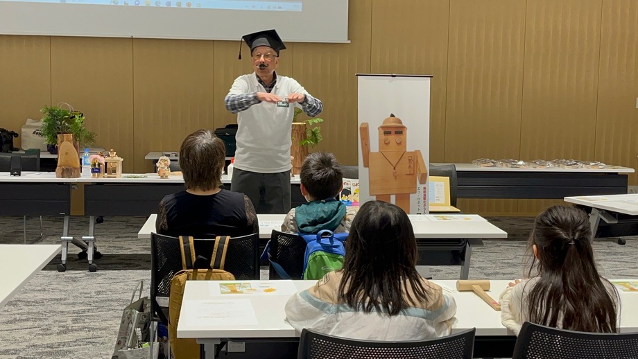 ロボ木―とは、島根大学名誉教授の山下晃功先生が開発したヒノキでできたロボットです。大きさは、身長が約1メートル、体重が40キロあり、年齢は61歳とのこと。なぜ61歳かというとロボ木―はロボットになる前に60年もの間、森の中で成長して伐採されたので樹木として60年、そして、ロボットになって1年ということで61歳なのだそう。