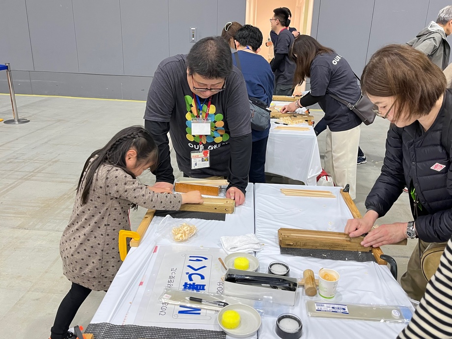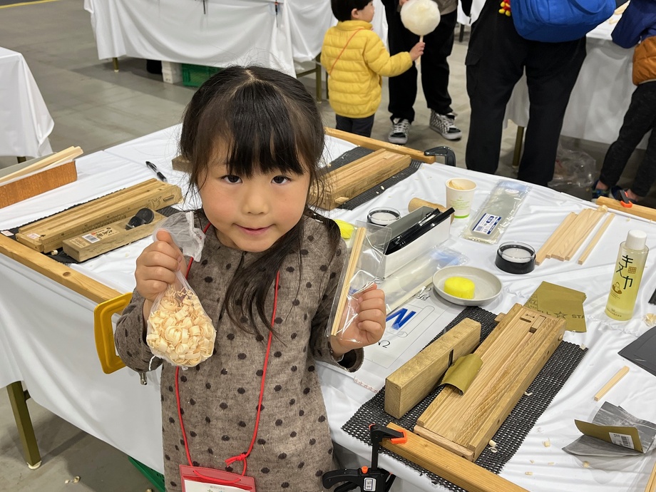日本の森林の割合は、国土のおよそ70%。これは割合で比較すると世界で3番目に多い国ということです。世界では森林の割合が減っていますが、日本は増えても減ってもいないそう。森林には「人工林」と「天然林」の2種類がありますが、日本での人口林の割合は約40%もあり、木を育てて活用するサイクルのバランスが上手く取れているということです。この好循環をこれからも維持するために木を伐採することが大事であり、木を育てて使うことは地球の環境保全にとって必要だと、箸づくりを通して子どもたちに伝える重要なコーナーだと感じました。