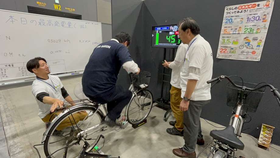 40秒間自転車を漕ぎつづけて、どれくらいの自家発電ができるのか?を体験できるブース。40秒間、一生懸命に自転車を漕いでも、発電量はたったの45W。トイレの電気を数分つける程度しか発電できませんでした・・・