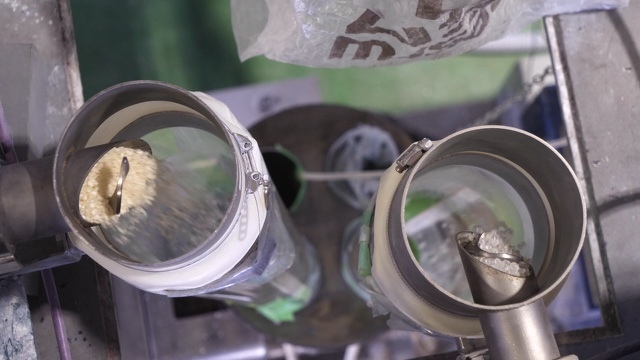 奥田さま:ライスレジンの製造工程としては、プラスチック素材数種類と古米や破砕米、そして添加剤などをブレンドして高熱で炊き上げ、お餅のような状態にします。