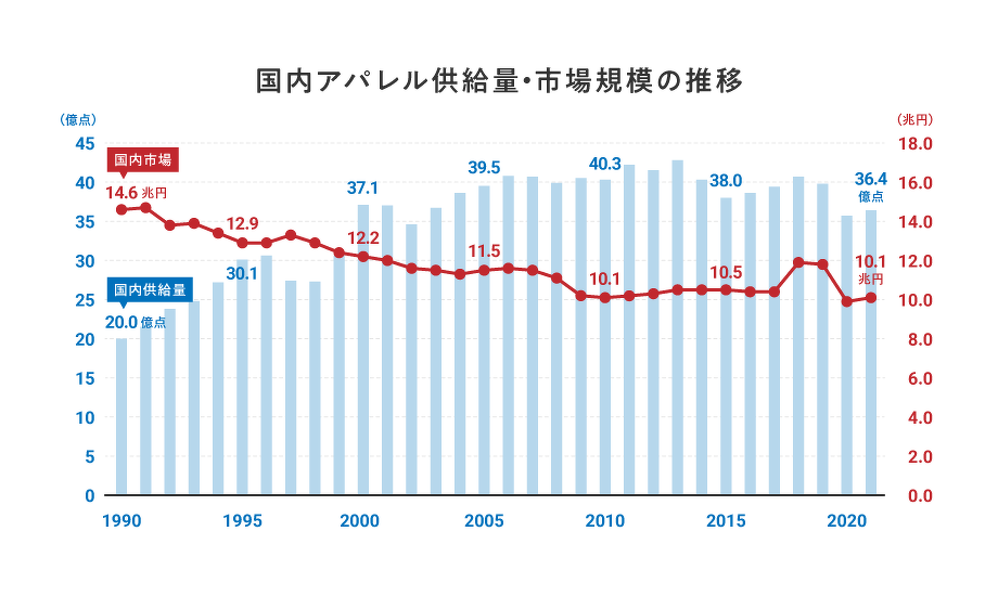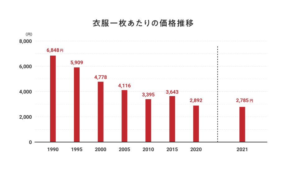 この大量に生産し大量に消費するサイクルは現在まで加速し続け、日本のアパレル業界では、1990年から2021年の間に市場が7割に減少する一方で、アイテムの供給量は1.8倍になるという歪な状態にあります。それに伴い、衣服1枚あたりの平均価格は3分の1近く下がり、今では簡単に手に入り簡単に捨てられるものとなっています。