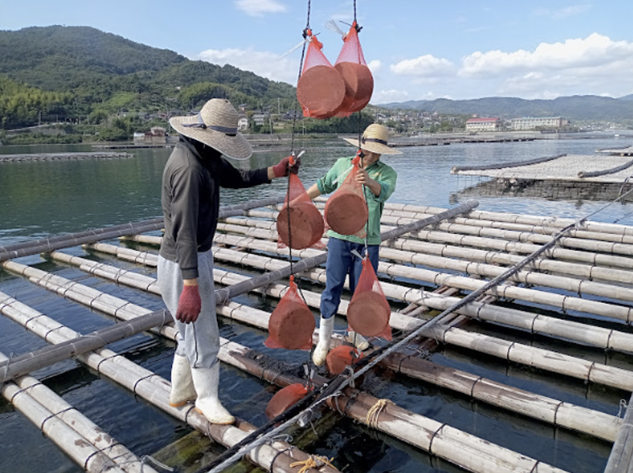 牡蠣イカダにMOFU-DXを吊るす様子。牡蠣のエサである植物プランクトンの増殖に役立つ。