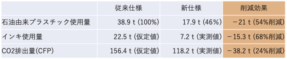 河嶋さま:バイオマスフィルムの導入にあたって、印刷の色数変更を行ないました。具体的には5~6色のインキを使用していたものをこのタイミングで3色に減らしました。