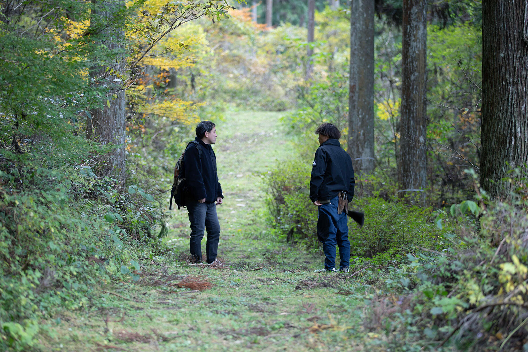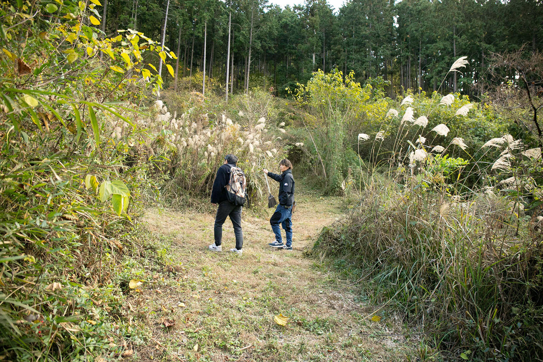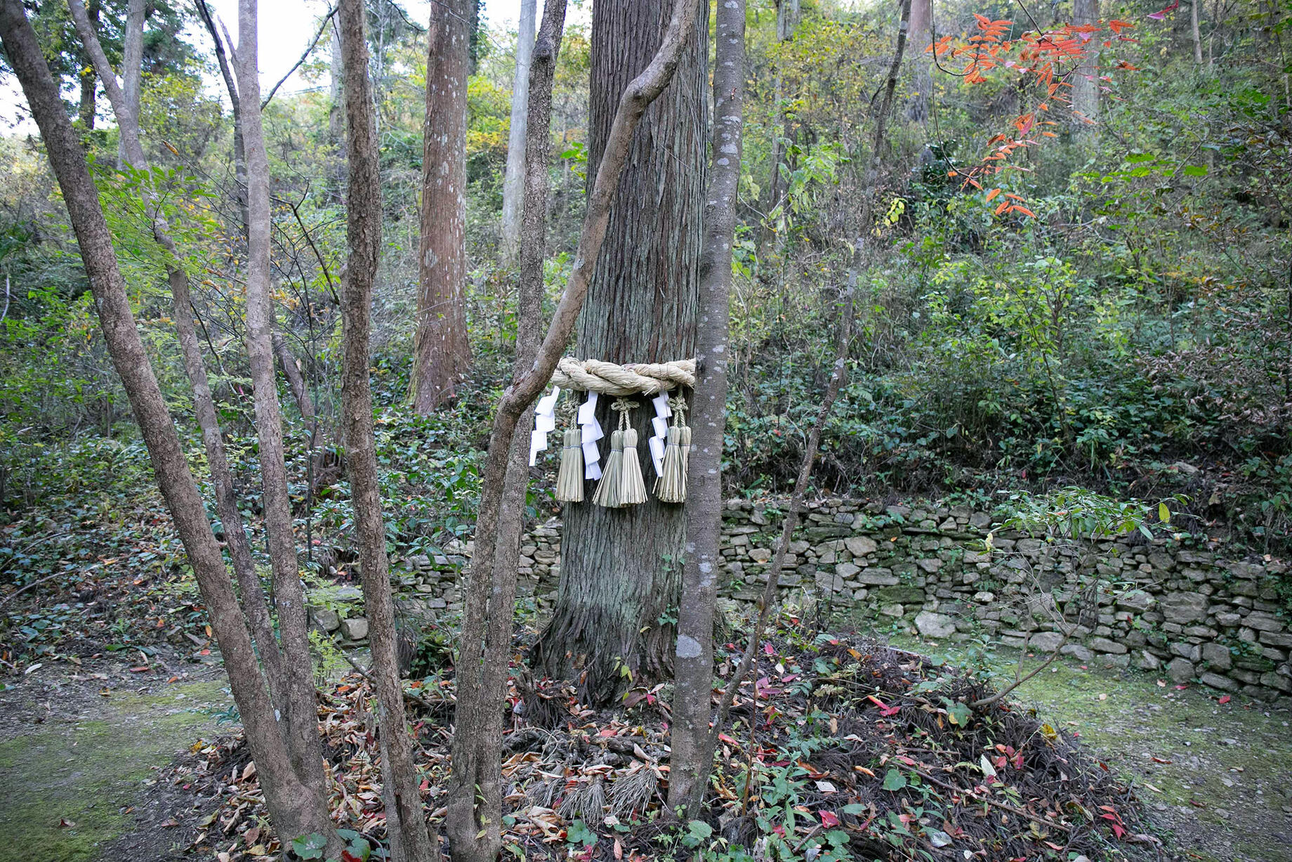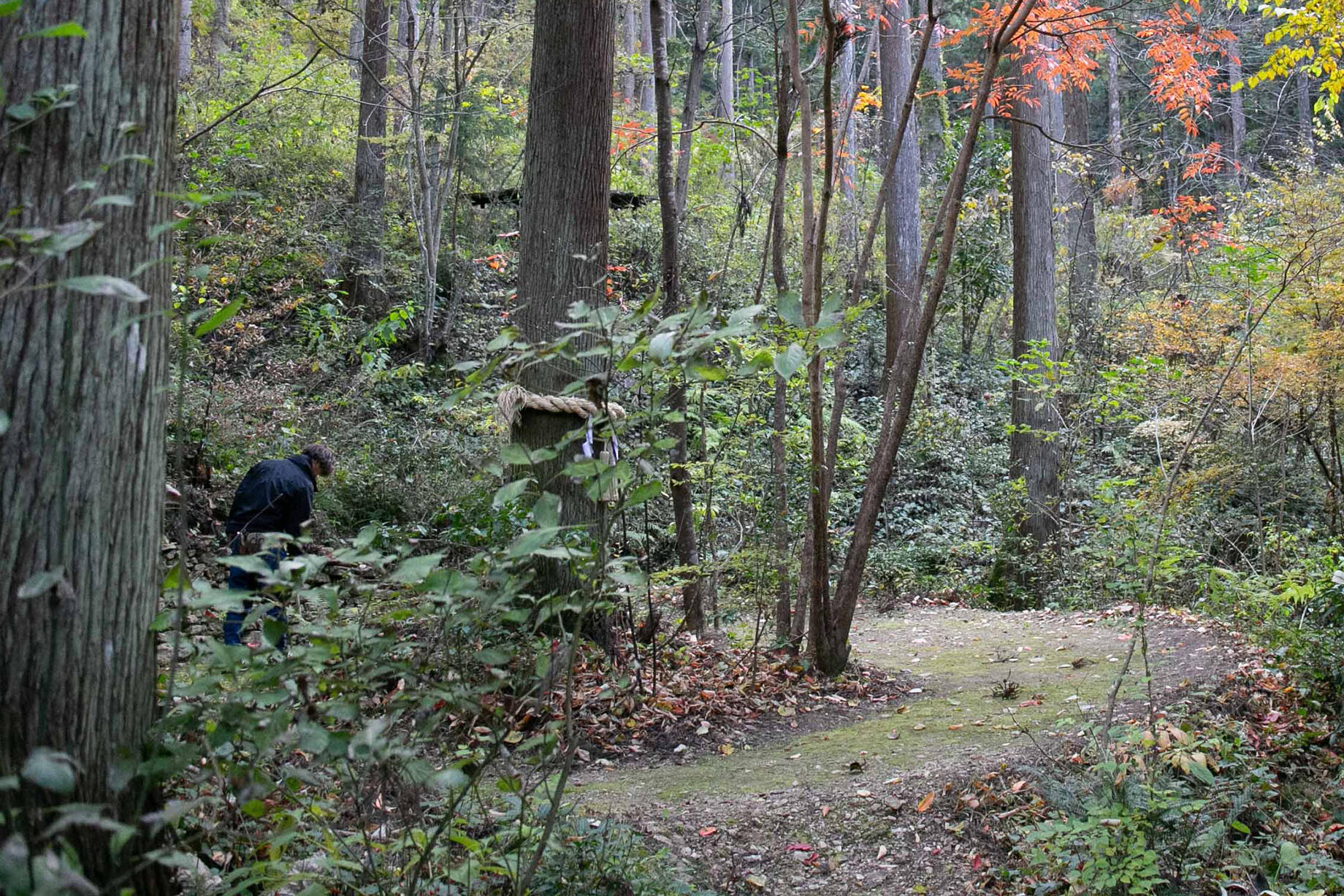 人が集まれるスペースには、プロジェクトの始まりを示すものとして、小野さんが選んだ杉の木にしめ縄がかけられている。「いま、このしめ縄にしるし以上の意味はないけど、きっとこの先、この行為そのものに別の意味がついてくると思っている」と小野さん。人を案内する時には、必ず箒で通路の落ち葉を掃除してから案内しているそう。プロジェクトの大切な場所に導くための厳かな儀式にも感じられる。