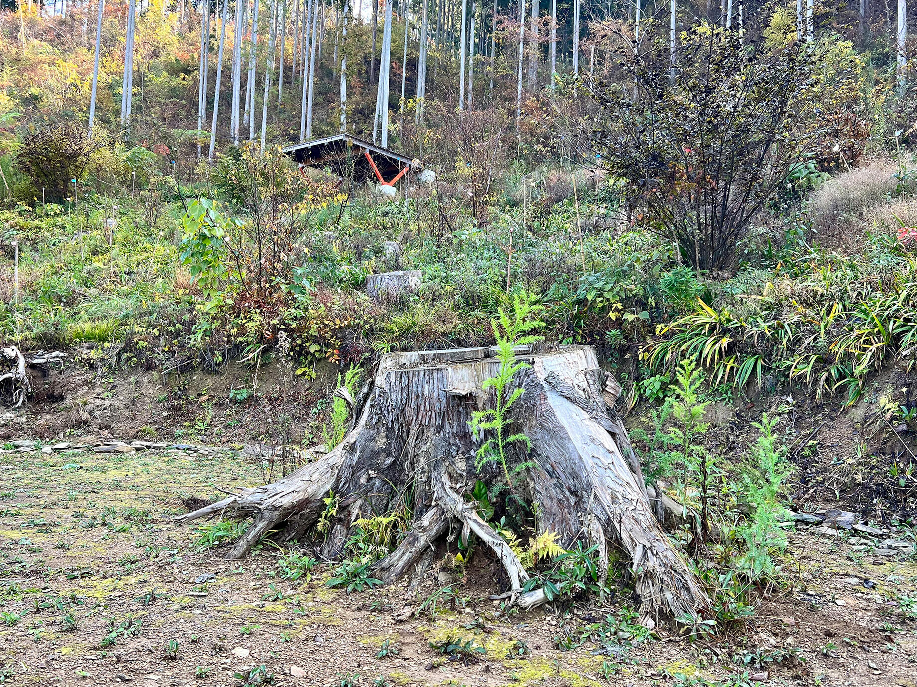 スギの他に太陽光を好むコナラ、トチ、ウラジロカシ、ケヤキ、モミジ、合計6種175本の苗木を植樹した以外は、自分たちが使う通路とちょっとした休憩スペースを確保。そこには、未来の御神木となるものとして杉の切り株を真ん中に新たなスギが10本まとめて植えられた。