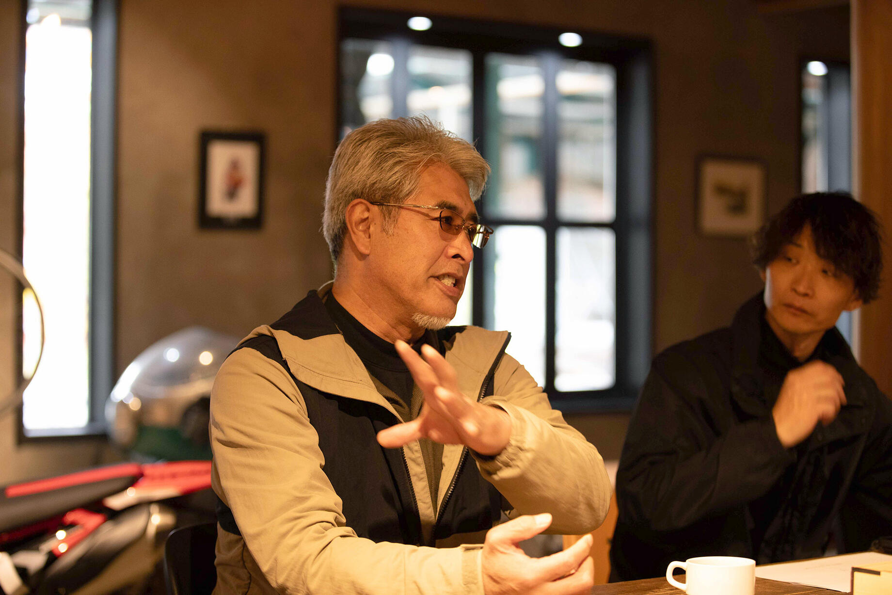 カフェの入り口にて。左から、井部悠紀さん、小野豊さん、井部弘さん。