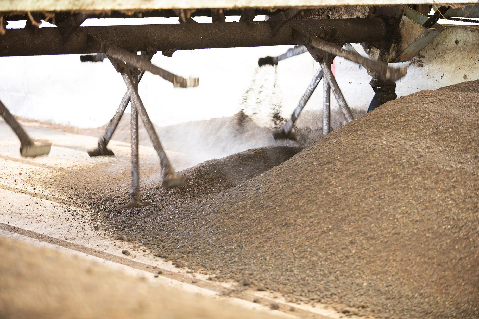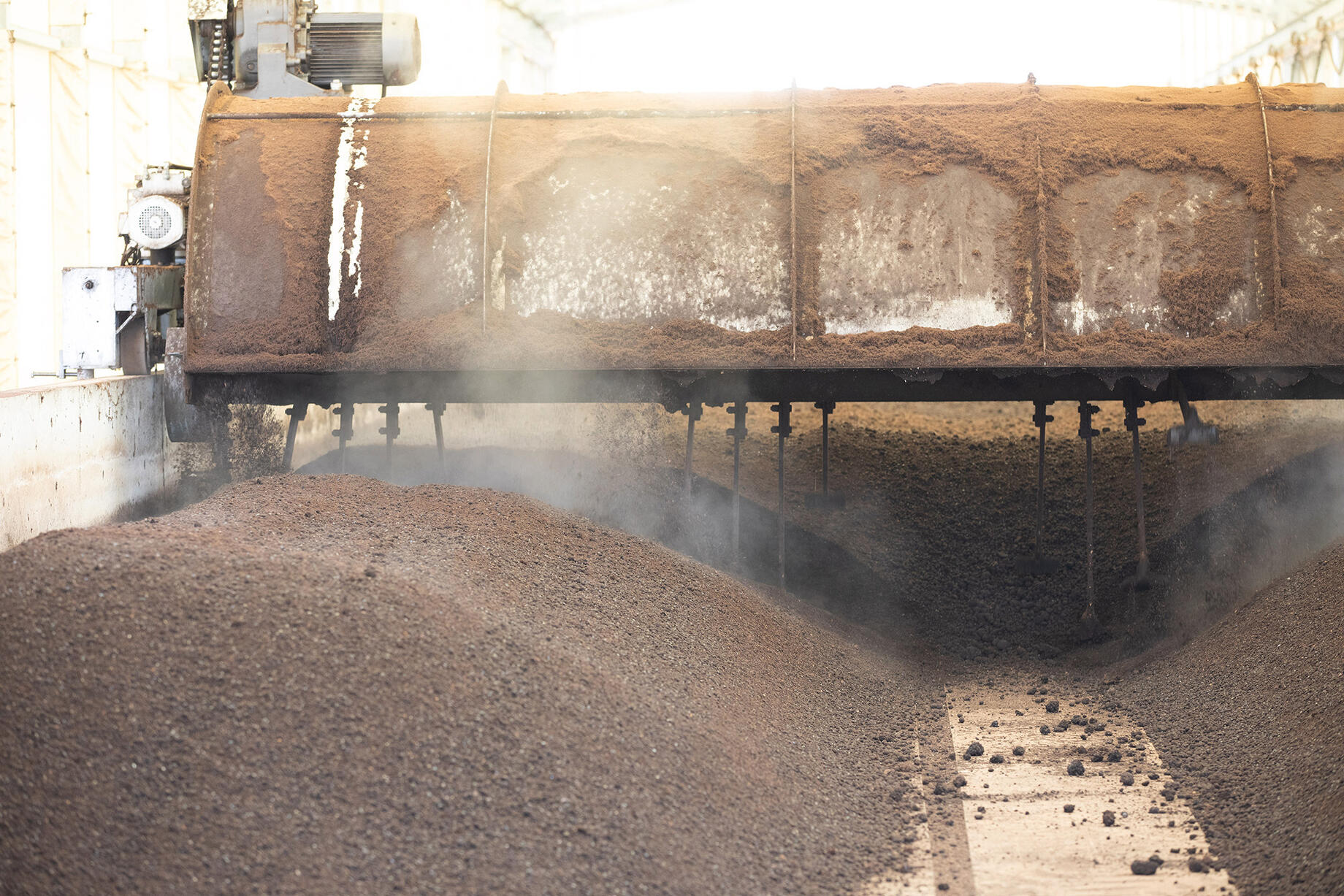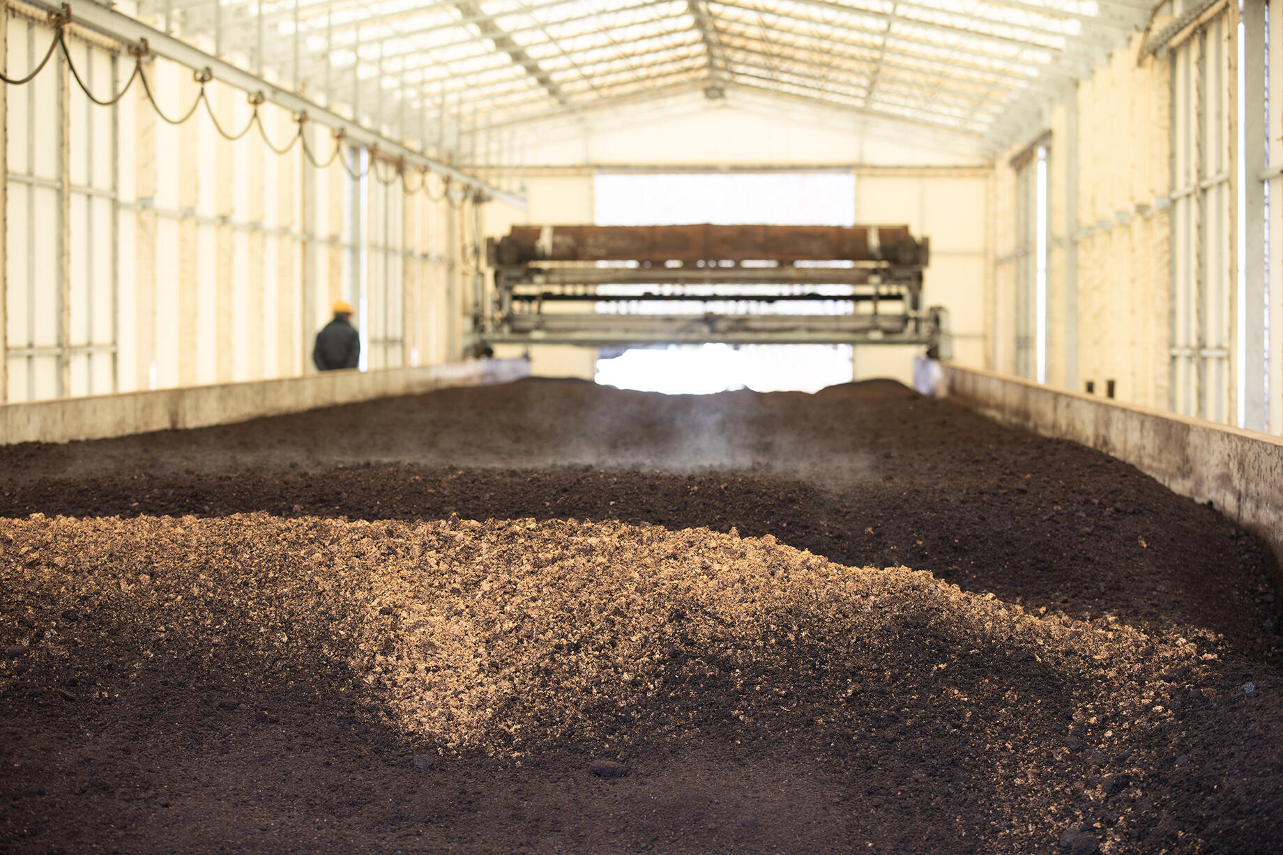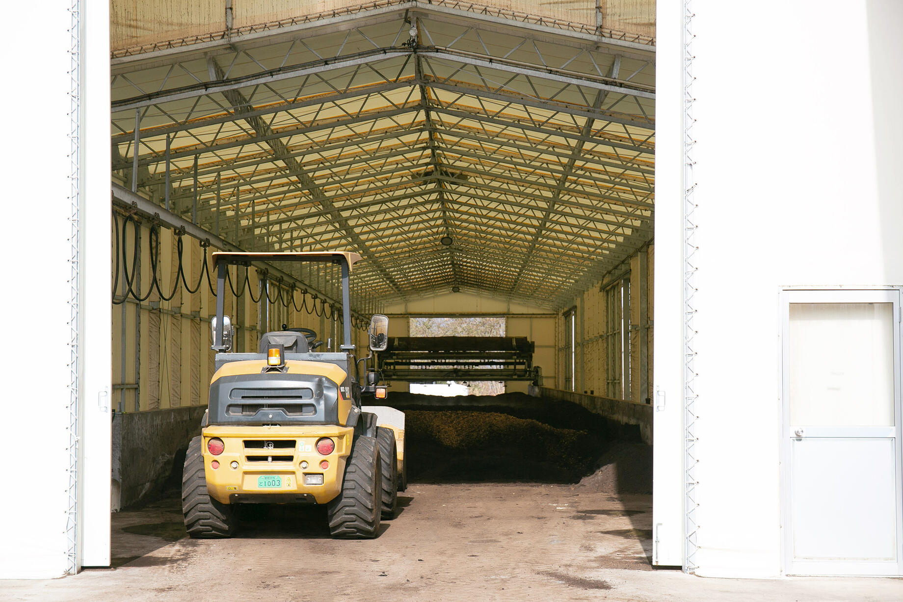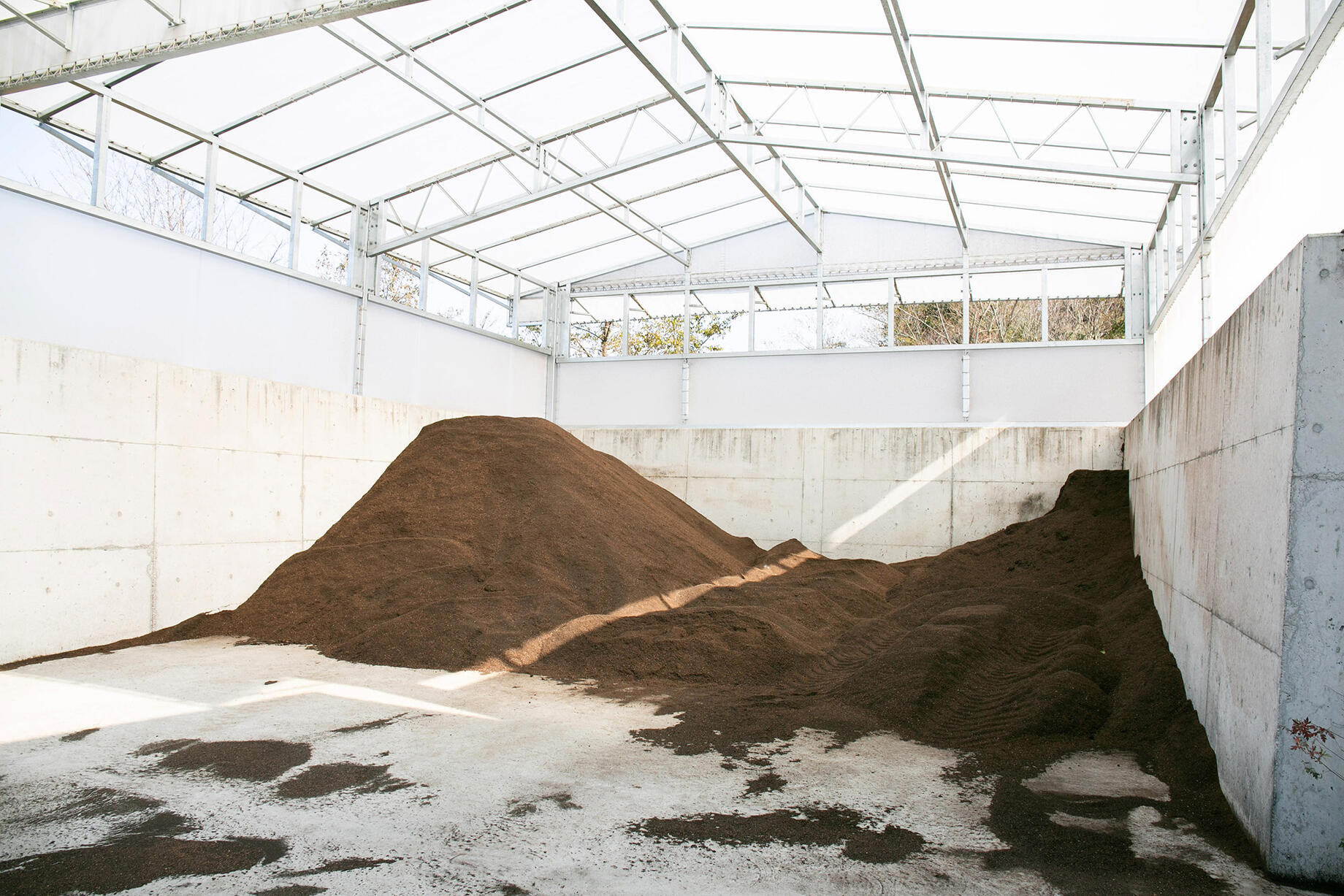 プラントの仕組みは、実に簡単。細長いプラントの入り口に、茶殻、コーヒーかす、椎茸の廃菌床などの原材料をトラックで運び込み、撒く。そこに細かく砕いたクリンカアッシュと、種菌となる完成した堆肥をいれるだけ。