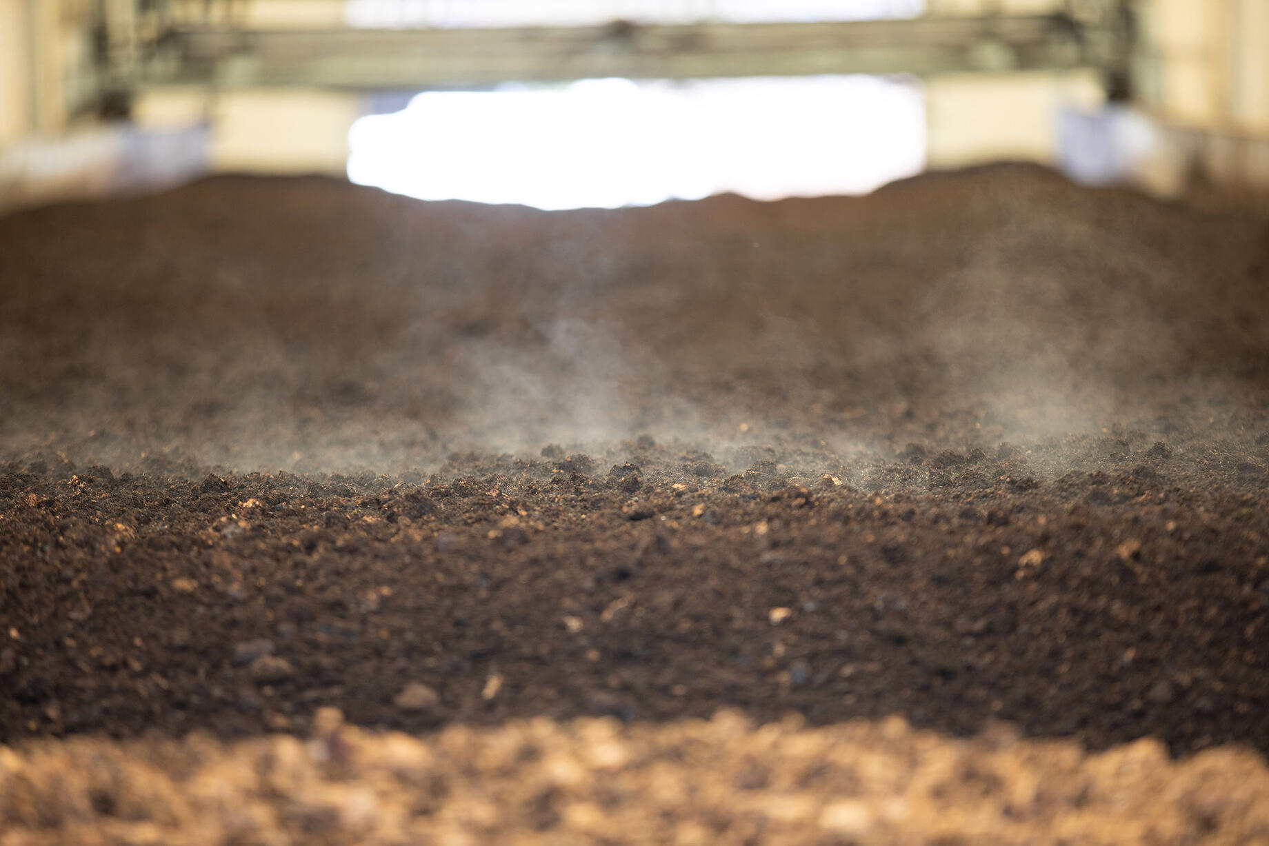 細長いプラントを往復する攪拌機により、混ぜ合わされた原料は、茶殻の水分と種菌の微生物の働きでプラントの奥に行くごとに好気発酵が進んでいく。発酵具合は、空気を送り込むことで調整しているそう。それ以外は、気温管理も加水も不要。廃棄物も一切出ない。原料がプラントの奥に移動するのは、かき混ぜる際の反動を利用していて、必要なのは、攪拌機や原料を運ぶ重機とコンプレッサーの燃料だけだ。発酵しているので何かの匂いは少しあるが、原料が全て植物性なので、気にはならない。原料となる廃棄物以外の余計なものは何も足さず何も引かず、作り方までまったく無駄がない。