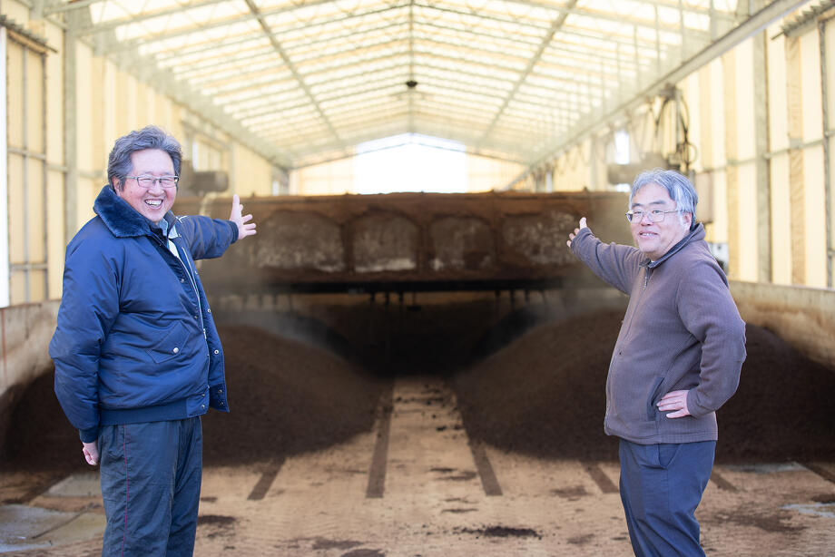 堆肥製造を開始した頃は、会社に運び込まれる原料を、岡さんが発酵の様子を見ながら毎日ショベルカーで撹拌しながら作っていた。まさに手作りだ。農業の勉強会に参加することで知り合いができ、堆肥をつかってくれる農家さんも増え、ついには堆肥の製造が追いつかなくなった。
