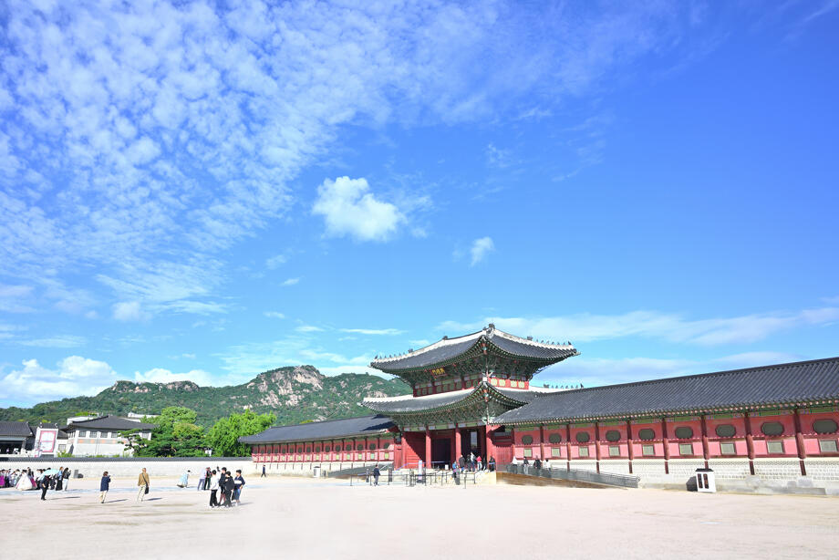 ふと見上げると、白い岩肌が剥き出しになった山々が街を囲んでいます。 王宮の「景福宮」も、やはり花崗岩が主役。敷地内に敷き詰められた真っ白な砂も、花崗岩が風化して自然にできたものです。