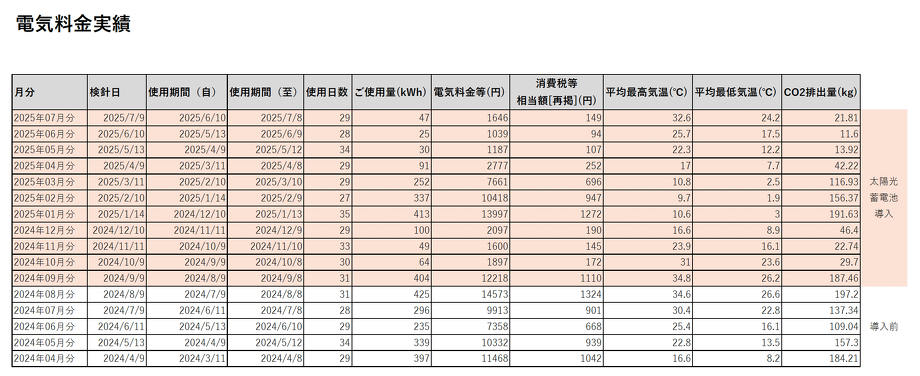 4人家族で1年の中でも生活スタイルの変化など諸々あるため、参考例ですがこんな感じです。高いか安いかの数値よりも太陽光と蓄電池導入での電気購入量の変化をお伝えできればと思います。今回は詳細割愛しますが、蓄電池がいっぱいになった後で売電も行っているため、変動ありますが月々数千円の売電収入もあります (売電価格は導入のタイミングでも前後します)。