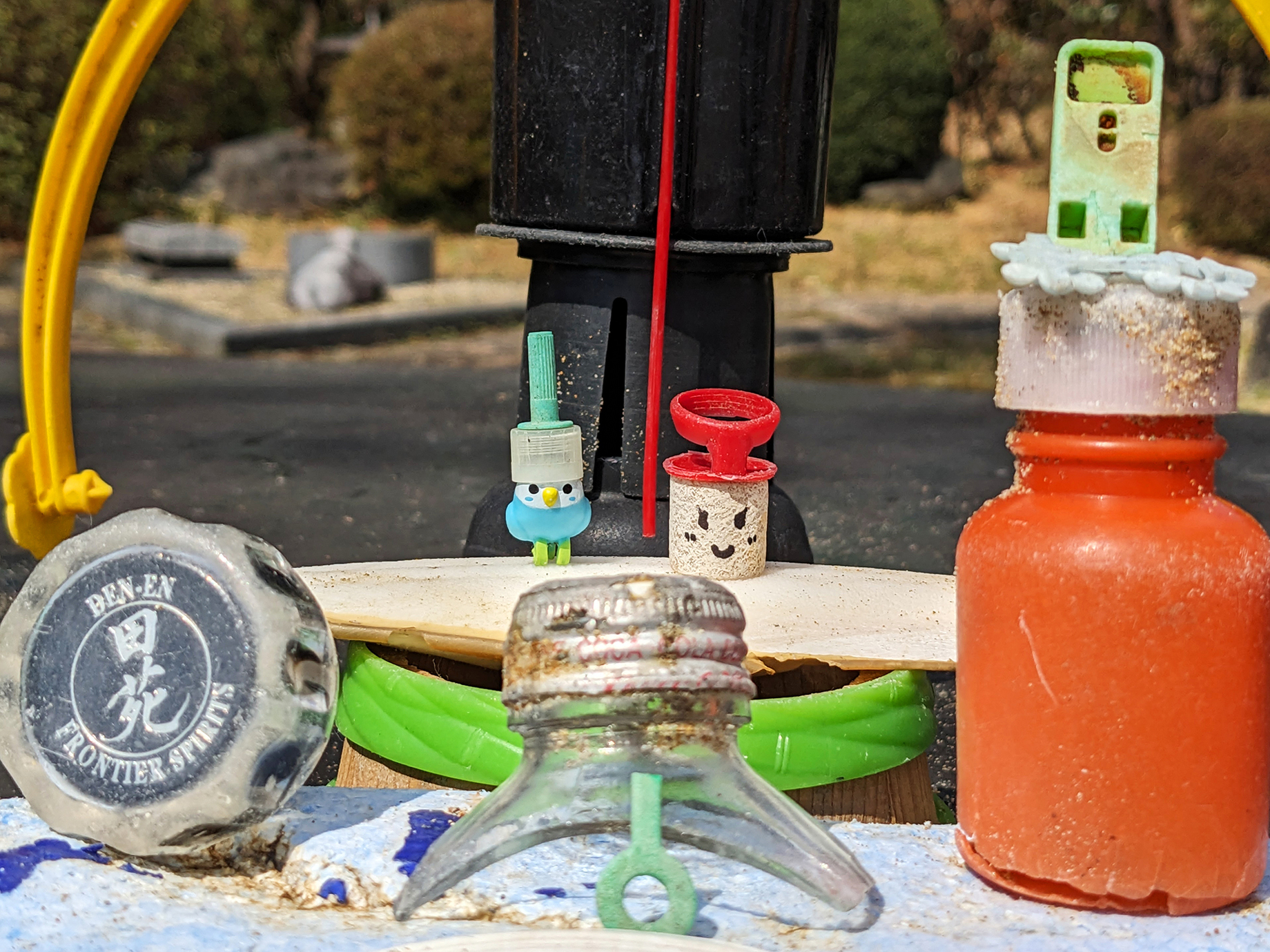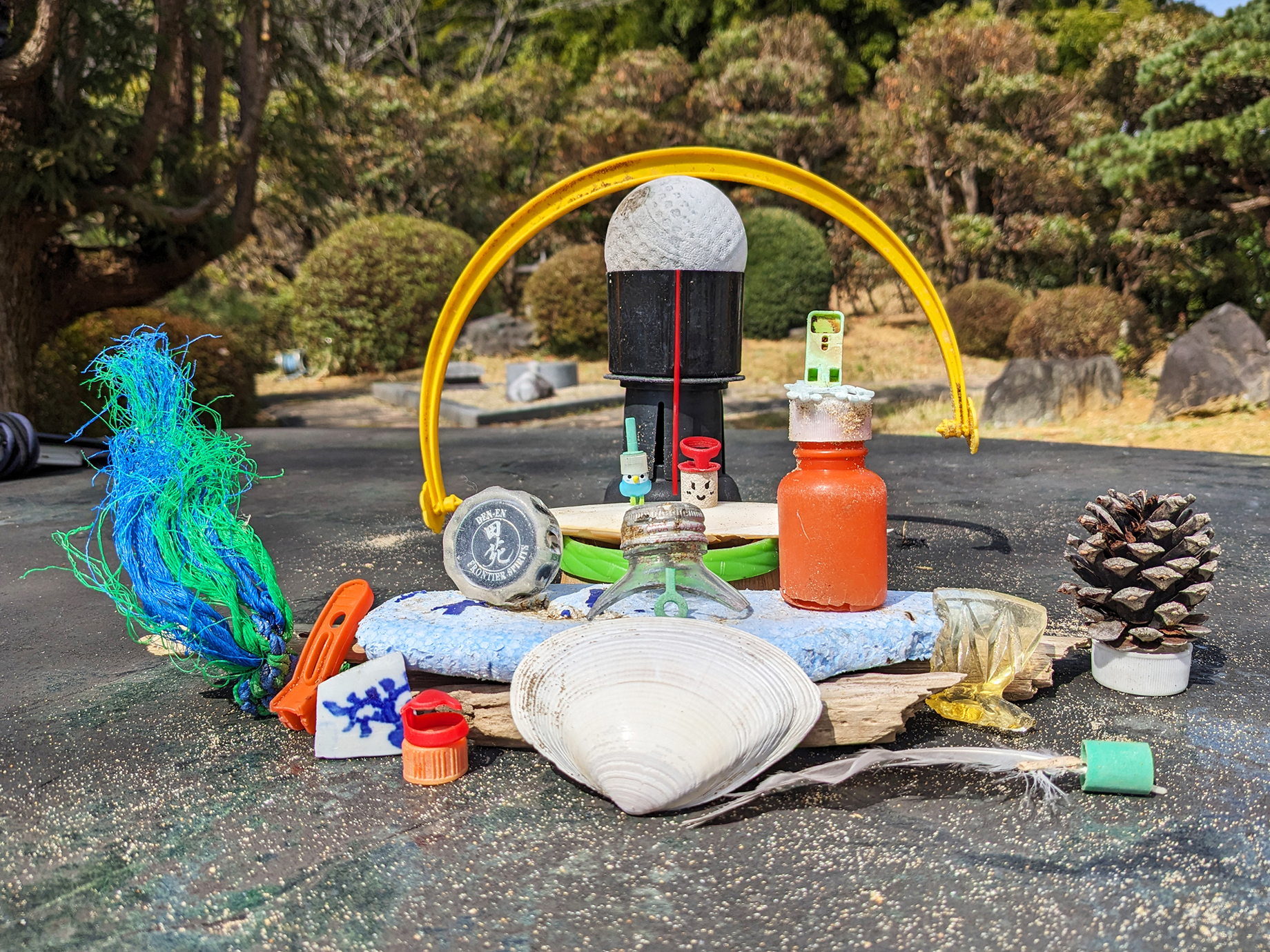集まったゴミの中にインコのおもちゃがあったのがウルトラGoodポイント。あとはパートナーになるオブジェクトを見つけて、お内裏様とお雛様の完成。それをデコレーションしていく感じで大物小物を配置しました。造形バランス、配色バランスを見て、かなりうまくまとめられたと思います。向かって左にある青と緑のグシャグシャ、右の松ぼっくりはそれぞれ橘と桜のイメージです。そして背後にあるバケツの取っ手(?)、この弧が作品をまとめ上げるのにかなり重要なアイテムとなっているのはみなさんも気付くところでしょう。ボールと組み合わせることでやじろべえチックになっているのもExcellent!撮影時にはわずかな風にも揺れ、まるでインスタレーションのよう。ちなみにお雛様の顔はマジックで描きました。これくらいの加工はお許しください。