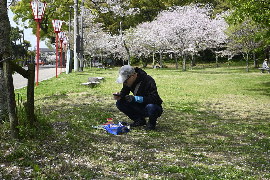 そんなこんなで清掃も終わり、映えそうなゴミもゲットできました。あとはこれで作品を作って…ああっ!天啓にうたれました。もう葉桜になっているとは言え、まだ桜を愛でられるタイミング。これを利用しない手はない!というわけで少し移動して琴弾公園にやってきました。