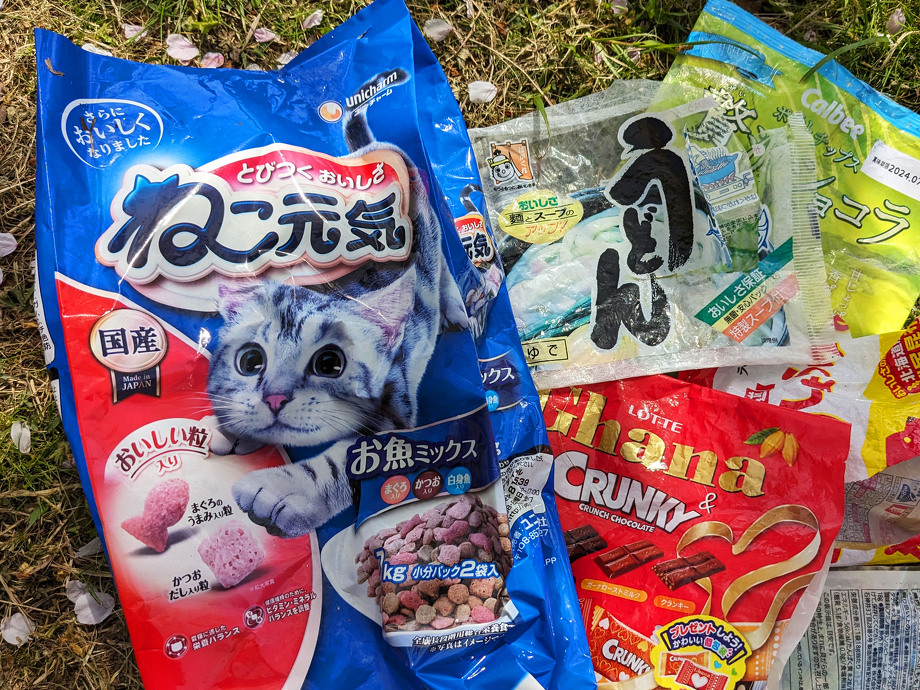 軟包材が多かったことから、軟包材縛りで作ってみました。赤、青などビビッドなもので構成し、色での映えを重視。周囲に散った桜の淡さと人工物の派手さでコントラストを出しています。調和ではなく違和感におもしろさを見いだしていただければ。