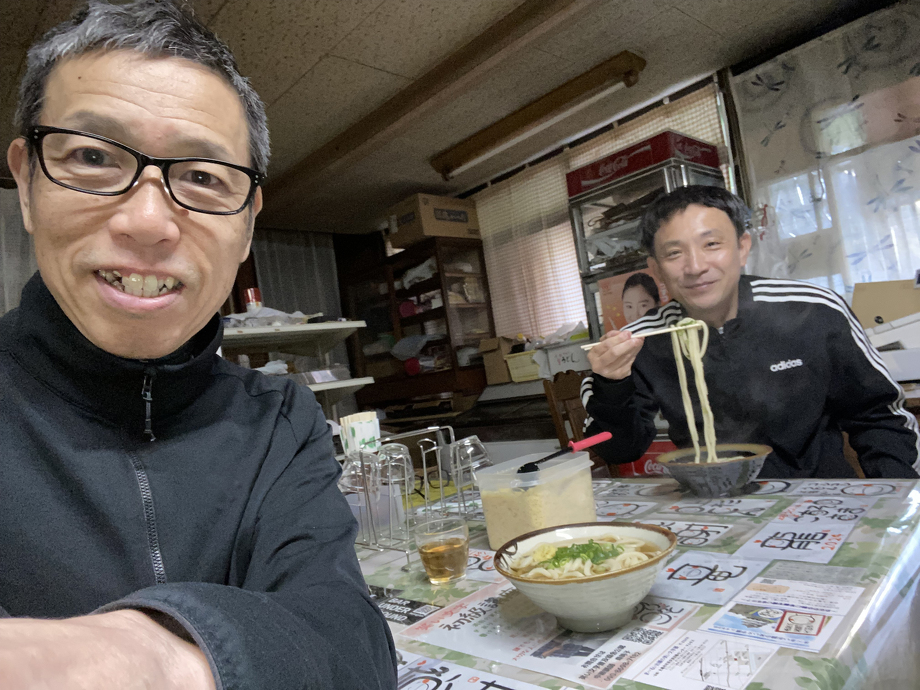 同僚のざっくんこと岡崎さんも合流して、ふたりで温かい「かけうどん」。