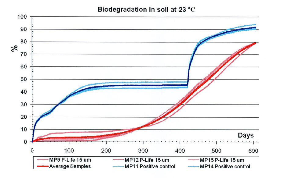 低分子化合物を土壌や海洋の微生物が栄養源として取り込み、最終的にCO₂とH₂Oへ分解します。重要なのは、P-Lifeは“砕く”のではなく、“食べられる分子へ変える” のです。ISO17556、JIS K6955といった国際規格でCO₂発生量を測定し、真の微生物分解を証明しています。