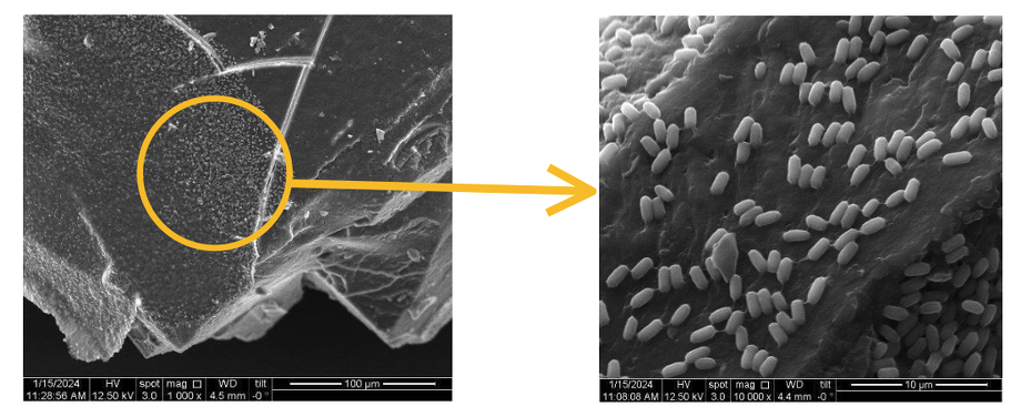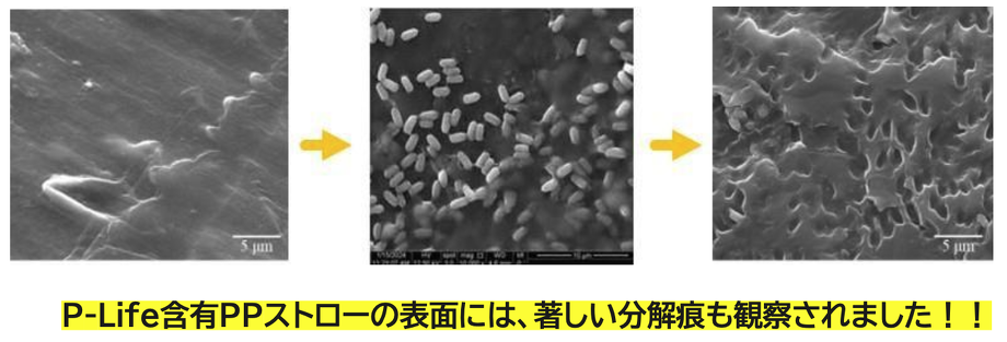 電子顕微鏡画像(左写真)は大量の微生物(分解菌)がP-Life含有PPストローの表面に直接付着していることを明確に示している。