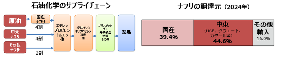 ナフサは原油を蒸留して得られる軽質油で、エチレンやプロピレンなどの石油化学基礎製品の原料となり、PP(ポリプロピレン)やPE(ポリエチレン)などのフィルム、インキの溶剤などに広く使われています。日本で使用されるナフサは国内で原油から蒸留されたものが約4割で、その他の約6割が輸入に依存している中、原料調達の安定化と環境負荷低減が急務となっています。